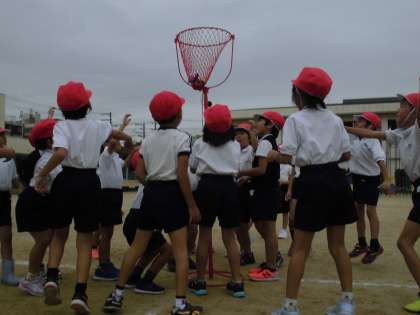 1年生の団体競技は、「しっかり・ひょっこり・たまいれはん」という名前の「玉入れ」です。(^O^)