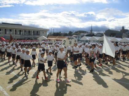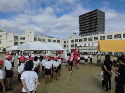 校旗、体育旗、赤白団長、赤白団旗が先導し、6年生から堂々の入場行進です。1年生にとっては、小学校初めての運動会。そして、6年生にとっては、小学校生活最後の運動会です。それぞれが、いろいろな思いを胸に、秋晴れの中の行進でした。