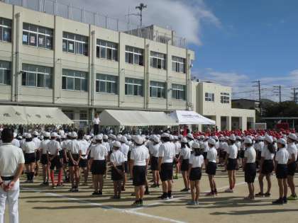 開会式では、開会宣言、校長先生のお話に続き、赤白両団長からの優勝杯・準優勝楯の返還があり、その後は児童代表による「誓いの言葉」です。自分たちで考えてきた言葉を、息ぴったりに宣言してくれました