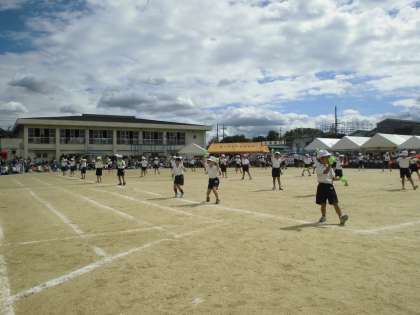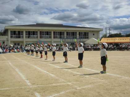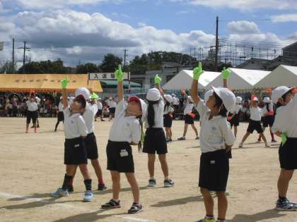1年生の団体演技「ぼうけんへ しゅっぱつ!」の様子です。