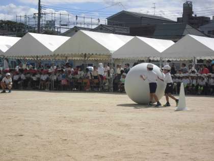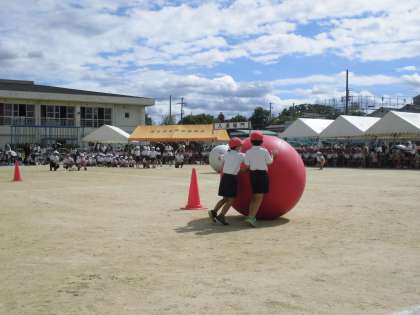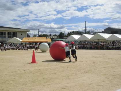 2年生の「大玉ころがし」の様子です。自分たちの背丈よりも大きい大玉を、転がしながら運ぶのは結構難しく、二人で力を合わせながらも翻弄される姿がかわいらしかったですね