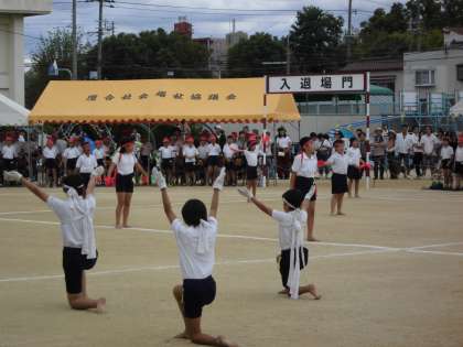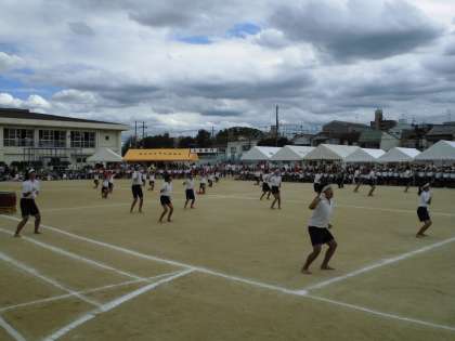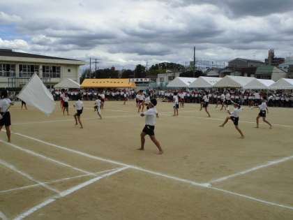 応援合戦の様子です。両団長が中心になって、応援団をまとめ、運動会を盛り上げるために、一生懸命頑張ってきました。赤組団長が、声を限りに「赤組がかぶっている帽子の色は、何色だああああっ!」とコールすると、「赤!!!!」と答える赤組全員。白組団長の「冬に降り積もる雪の色は、何色だああああっ!に「白!!!」と答える白組全員。三々七拍子や二三二拍子など、太鼓のリズムに合わせて、応援団と児童全員での掛け合いが続きます。