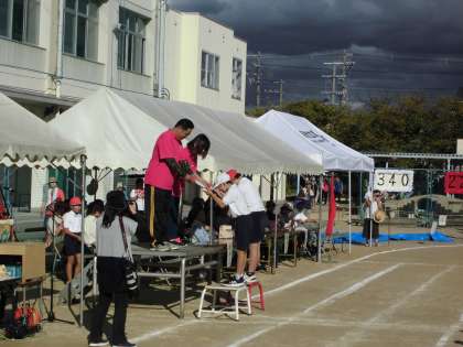 さて、秋晴れとはいえ台風の過ぎた後なので蒸し暑く、熱中症に気をつけなくてはならない天候でした。児童用テントを全席張ることができてよかったです。水分補給を頻繁に呼びかけましたが、途中気分が悪くなった児童もいました。手当てをしてもらってしばらく横になると、体調も戻って自分の席に帰ることができていました。それでも、運動会後に教室に帰った時、少しでも涼しい方が疲れも癒されるだろうと、事務の藤原さんが全教室にエアコンをつけてまわってくれました。それで…。閉会式の写真がありません。PTAの方からの参加賞をいただくところは間に合いました。ということで、優勝杯・準優勝楯授与の写真はないのですが、教室に戻った時に子ども達は、「気持ちいい!うれしい!」となったようです(^O^)