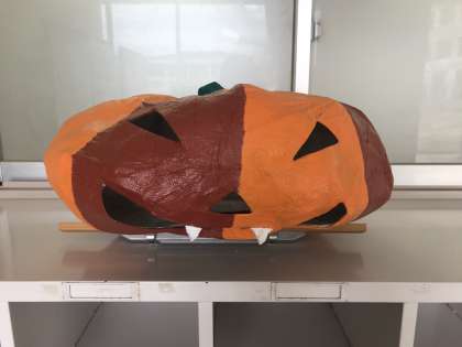 かぼちゃです。HALLOWEENです。ハロウィンのかぼちゃの手作り張り子があったのを思い出し、出してきました。「昨年度は、事務の西村さんがかぶってホームページに載ったよ」と藤原さんに伝えましたが、「そういうキャラは大原俊介先生です」とのことでした(^_^;) 大原先生は確かにかぶってくれそうです(笑)保健室前に飾ってあります。