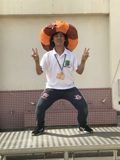 昨日の、カボチャの続報です。大原先生は、やっぱりかぶってくれました。「ええっ!?なんでですか〜」とか言いながら、心の中で「おいしい(^^)」と思ってたに違いありません。だって、このポーズですよ。私は、何も言ってません(笑)