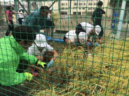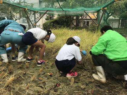 運動会が済み鷹合田を見ると、稲は黄金色に実り穂を垂れています。昨年度の鷹合田1年目は、賢いスズメ軍団に簡単に網の目を掻い潜られ、稲刈りをしようとするときには、ほぼワラ状態…(-_-;)でした。今年度は、網の目を細かくして、スズメに勝ちました(^O^)
