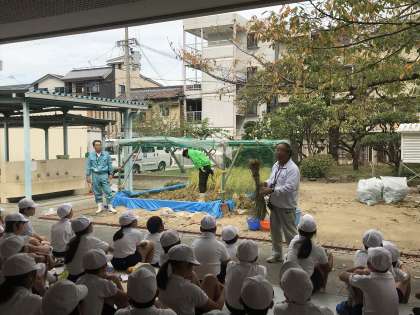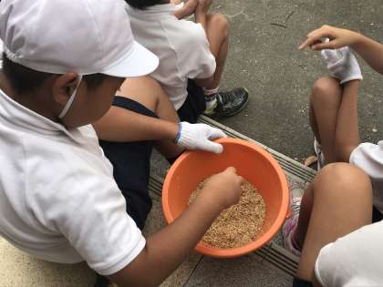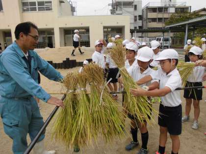 束ねた稲穂を乾かした後のことを教えていただきました。稲わらとモミに分けて、モミ殻と玄米に分ける。ここまでは、手作業でがんばって「米」になるまでの苦労を体感する予定です。前任校でもしましたが、モミをすり鉢に入れて、ソフトボールなどで「ゴリゴリ、フーッ!」と分けていきます。粉が目に入るなどして困るので、扇風機の前にすり鉢を置いたりしたものです。