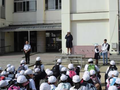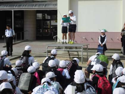 たてわり班ごとに運動場に集合し、児童会代表委員司会の下、開会式が行われました。そして班ごとに、6年生が先頭となって長居公園植物園に向かいました。