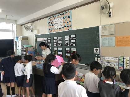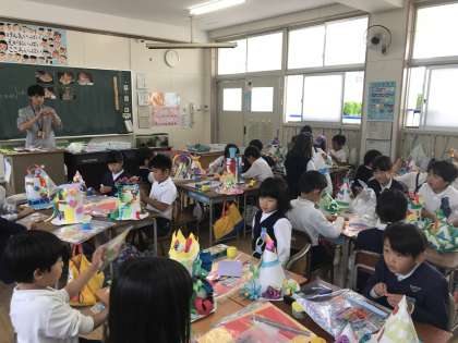 2年生は、工作「すてきなぼうし」を製作しています。紙の操作も複雑化してきて「おる」「まげる」「切ってたてる」「しずく」「あむ」「ねじる」等、いろいろな工夫を駆使して飾りをつけていってます。できあがりが楽しみですね。