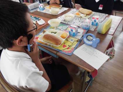 さて、「かみかみセンサー」が始まりました。今日は5−2の保健給食委員がモデルとなって実験しました。さて、何回かんだのかな?