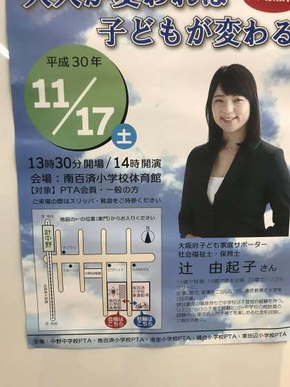 11月17日(土)南百済小学校講堂において、五校合同人権講演会が行われました。今年度の講師は、「大阪府子ども家庭サポーター・社会福祉士・保育士」の辻 由紀子さんでした。「大人が変われば子どもが変わる」というテーマで、ご自分の経験を取り混ぜながら、どうすれば家庭・地域・社会がよくなるか?について取り組んでこられた経験を話してくださいました。