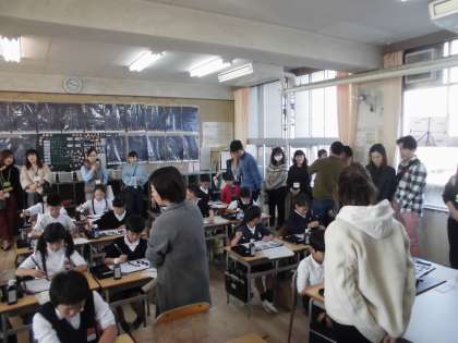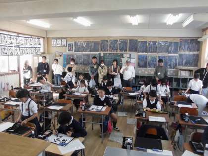 3年生は、習字で「すきな言葉」を書きました。「平和」「友情」「まごころ」「勇気」「仲間」「黄金時代」などの言葉をチョイスしていました。マーブリングをした和紙を台紙にし、そこに張り付けて、みんなで鑑賞しました。