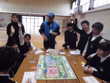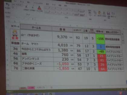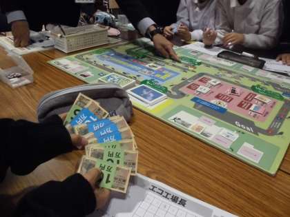 午後からは、カー&エコゲームというボードゲームにチームごとに取り組みました。リーダー、長官、大臣、工場長、所長という役割を与えられ、大きな金額を動かして、車づくりを行うというゲームでした。10万円、100万円、500万円というお金を遣い、環境に良い車を開発すれば破たんしかけ、反対に環境をないがしろにすると環境メーターが赤くなり、地球にとっては悪いことになる…、という展開。