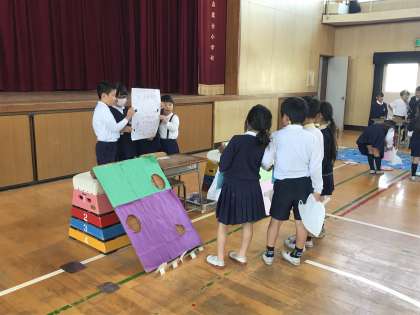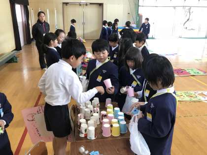2年生、2学期の生活科の集大成「おもちゃランド」を実施しました。1年生を招待して、風やゴムや磁石などの働きを利用したおもちゃを使っお店屋さんごっこを楽しんでもらいました。
