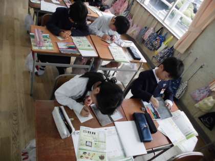 送りたい相手は事前に調べてきています。しかし、ちょうど国語科でも「案内の手紙を書こう」の学習もしていたので、自分の住所をすでに覚えて書けるようになっていた子もいました。何度もこのような経験を重ねることは大切なのですね。