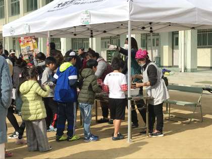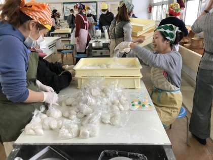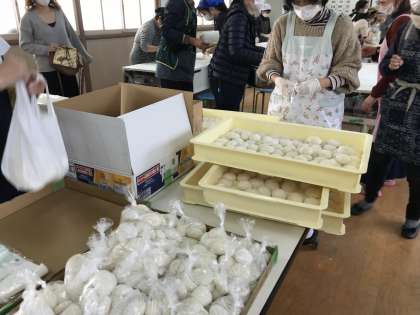 今年は、「そこのお母さんたち、よければ手伝ってください」とPTA役員のお父さんからお声掛けをいただき(笑)、矢田・森田・久野・河野で、餅をまるめたり、袋詰めのお手伝いをさせていただきました。