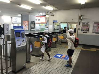針中野駅のホームでは、角先生が待っていてくれます。みんな、乗り過ごすことなく無事に降りてきました。