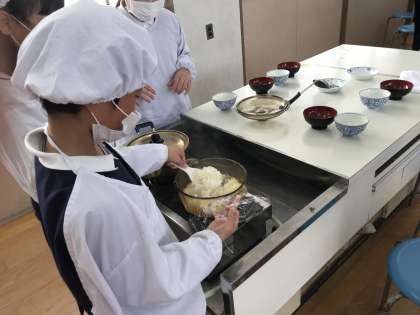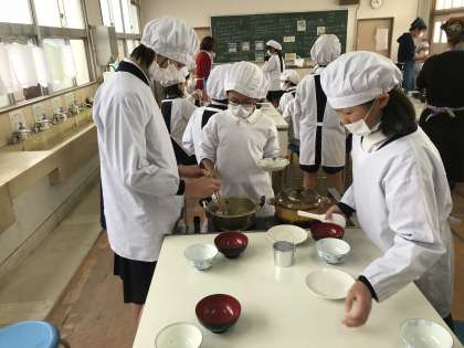 火曜日の1組に続いて、今日は2組の「ごはん」と「みそ汁」の調理実習でした。調理中の様子は、取材できなかったので(;^_^A、出来上がりから試食の様子をお伝えします。