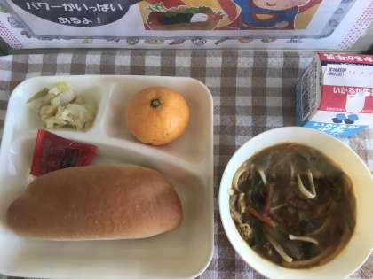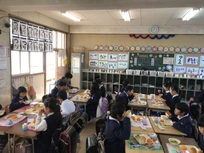 3年2組の給食の様子です。パソコンルームで、「名刺作り」をがんばりました。
