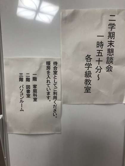寒い時期です。できるだけ、お待たせしないように担任は努力していますが、延びる場合もあります。1階は家庭科室、2階は図書室、3階はパソコンルームを待合室として、暖房をいれてますので、ご利用ください。