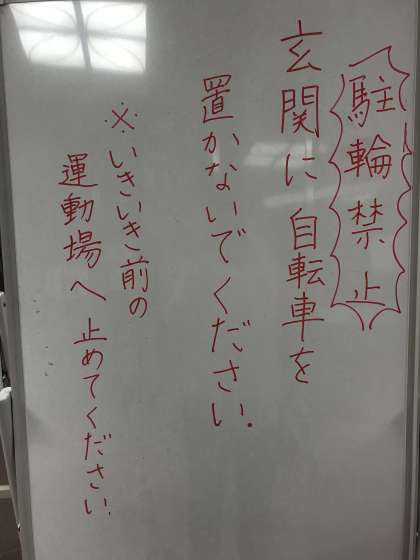 また、自転車での来校はご遠慮いただいていますが、やむをえない理由で自転車で来られた場合は、申し訳ありませんが、玄関先や学校前の道路に駐輪せずに、いきいき教室前の運動場に置いていただきますよう、よろしくお願いいたします。