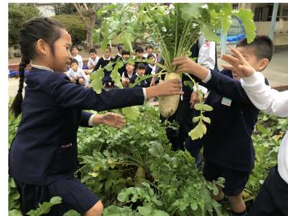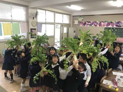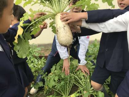 2年生の「田辺大根」りっぱに育ちました。今日、みんなで「うんとこしょ、どっこいしょ」と「おおきなかぶ」を思い出して、抜きました。ところが、それほど力をいれなくても、真上に力をいれるとスッと抜くことができました。
