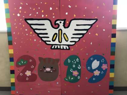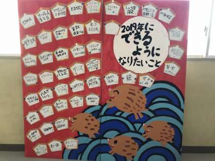 本校では、毎年3年生が担当しています。今年は、来年の干支の「🐗いのしし」と「新年の目標」、そして鷹合小学校の校章を学年みんなで制作しました。