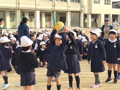 ボールを頭の上から後ろへ後ろへ送り、次は、前へ前へ送ります。先頭の子どものところへボールが戻ってきたら全員しゃがみます。学年内で、どちらが速いかの勝負でした。