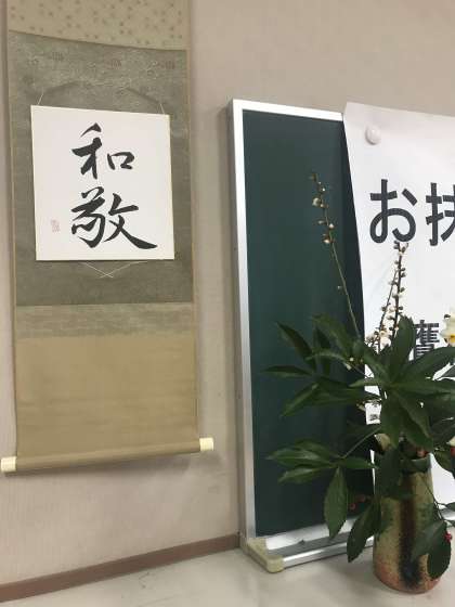 お軸とお花についての説明をしていただきました。お軸の「和敬」という意味は、「心をおだやかにして、相手を敬うこと」、そして、お花は「梅・水仙・椿・南天」の今の季節の花と教えていただきました。ふだんの和室が、凛とした空気感のある場に変わっていました。子ども達も、きりりと背筋を伸ばして、お行儀よく座っています。