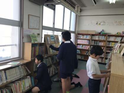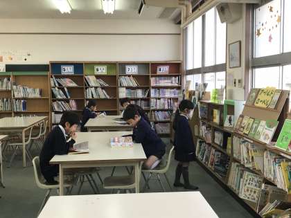 毎週水曜日と金曜日には、保護者の方や地域の方がボランティアとして来校され、図書室を開けてくださっています。今日は、いつもは運動場で遊んでいる高学年男子も来館していました。