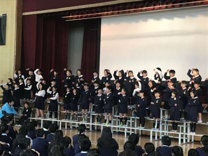 とてもかわいい姿に、見ている上級生たちが笑顔になっていました。そのあと、ハンドベルや鍵盤ハーモニカで「きらきら星」を合奏し、最後は「歌えバンバン」をパフォーマンスも入れながら、大きな声で歌いました。