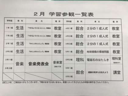 「できるようになったこと発表会」「わたしのたんじょう発表会」「音楽発表会」「2分の1成人式」「地球規模の環境問題の考察」「感謝の気持ちを伝えよう」いかがでしたか?ふだんなかなか見ていただけない理科室での学習の様子を参観していただいたところもありました。懇談会では、保護者の方々と共に、子ども達の成長ぶりを喜びあうことができました。