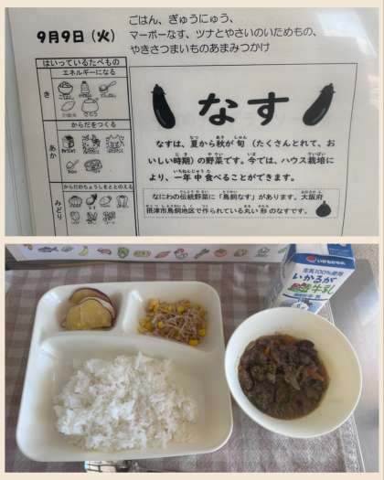 なすは今の時期が旬でとても美味しいですね。子どもたちの中にはなすは苦手という子もいますが、小さめに切ってあり、味噌の濃い目の味付けなので美味しく食べられたのではないでしょうか。