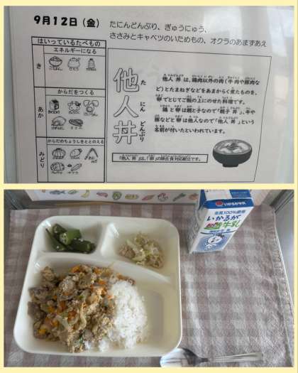 親子どんぶりは鶏肉と卵ですが、今日は牛肉を使っているので他人どんぶりになります。