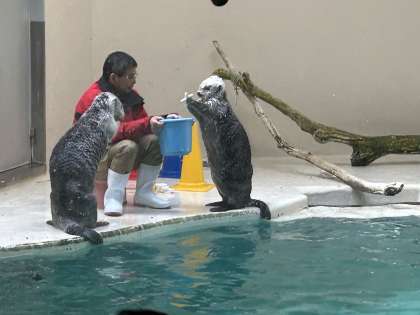 日本には鳥羽水族館にいる2頭しかいないというラッコには行列ができていました。写真はラッコに餌やりをしているところです。