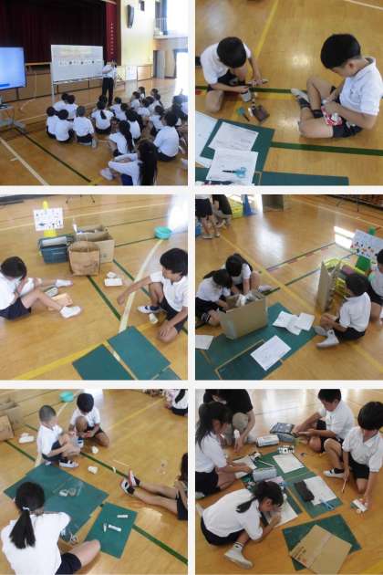 今日の授業はおもちゃランドに向けてのおもちゃ作りなので、活動しやすいように広い講堂で授業を行いました。