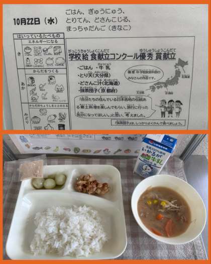 今回は日本各地の郷土料理がテーマです。とり天は衣がサクサクで中はジューシーです。どさんこ汁はみそとしょうがの香りが良く、今日は寒いので体が温まりました。