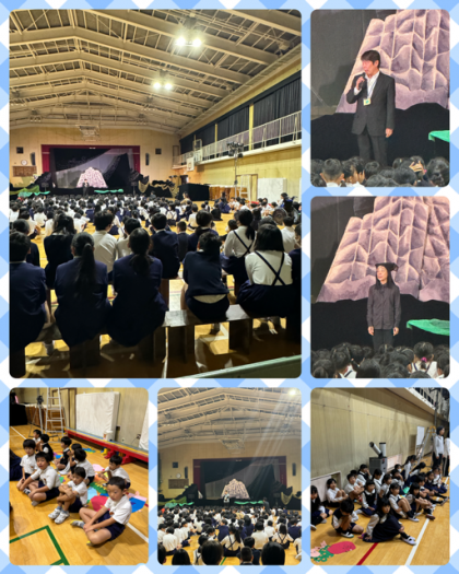 3時間目から始まるクラルテさんの人形劇に参加する2年生。今日は、事前に作ったや...