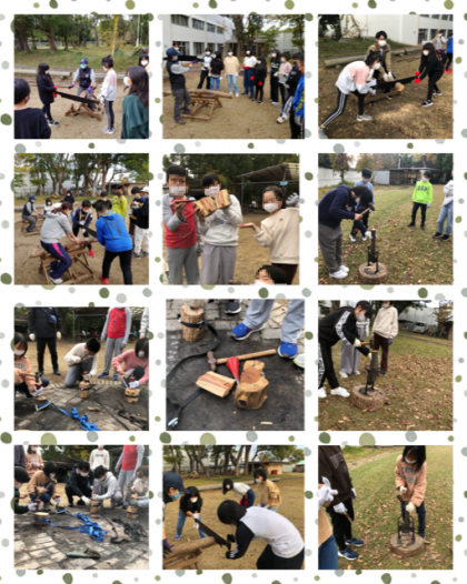 「薪割り体験」 くさびを使った薪割りや、両手引きのこぎり、ハンマーを使った薪割...