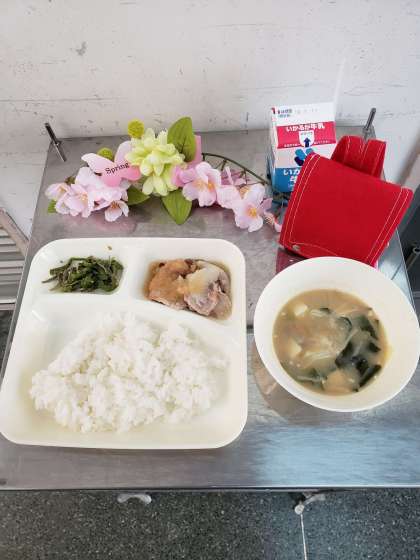 豚肉のおろしじょうゆかけ、みそ汁、じゃこピーマン