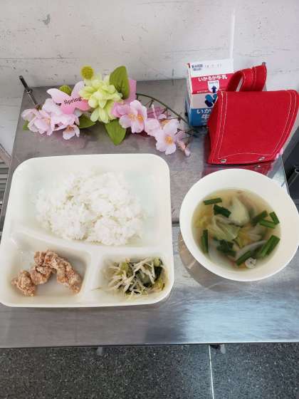 鶏肉のからあげ、中華スープ、チンゲンサイともやしの甘酢あえ