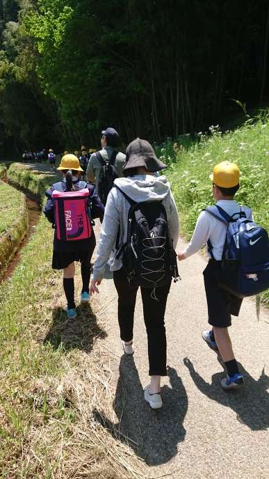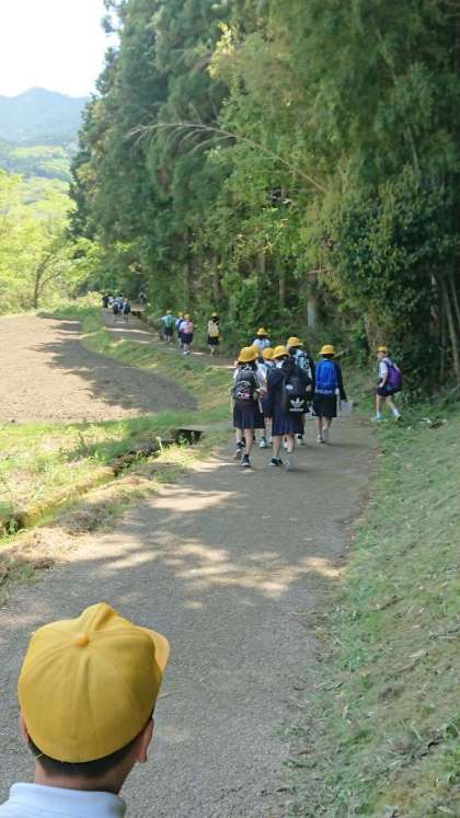 石舞台へ向かっています。班のみんなで協力して、疲れた子には「頑張れ」と励ます姿がありました。