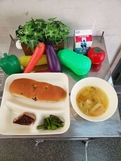 かつおのガーリック焼き、鶏肉とじゃがいものスープ、グリーンアスパラガスのサラダ