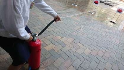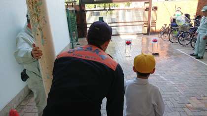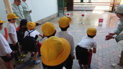 消火器の安全装置の解除の仕方を学び、火元に向かって正確に水を当て、消火することができました。子供たちからは「やったぁ〜」という喜びの声があがっていました。