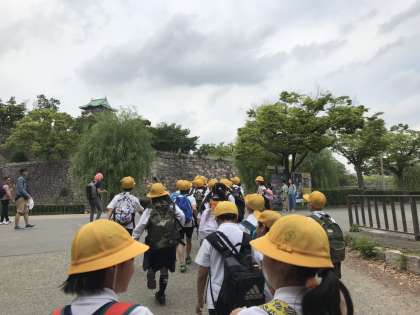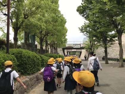 3年生は、大阪城公園に遠足に行っています。天守閣、目指して歩いてます。