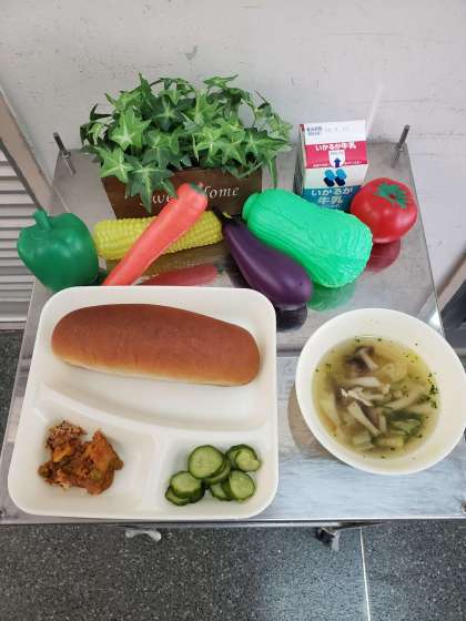 じゃがいものミートグラタン、スープ、きゅうりのピクルス