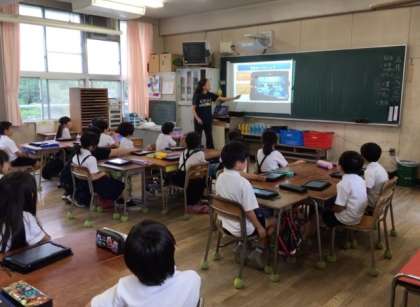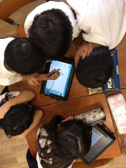 タブレットの操作説明の後、子どもたちは発表ノートの使い方を学びました。好きな食べ物は? 班ごとに手書き入力で答えの作成をしています。
