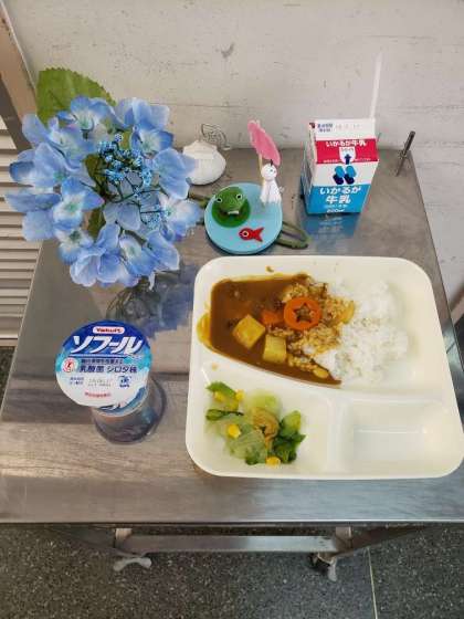 牛肉と大豆のカレーライス、レタスとコーンのサラダ、ヨーグルト