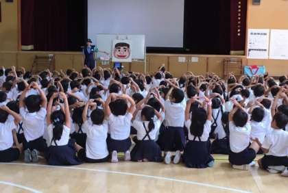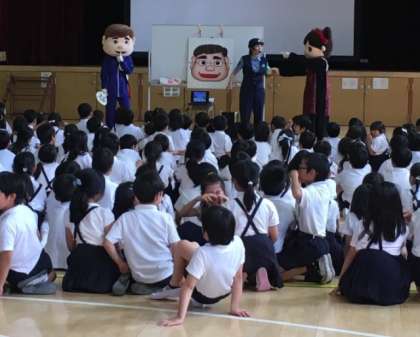 5時間目は、1〜3年生対象の防犯教室です。東住吉警察署の「知らない人に、ついていかない。」をテーマにした劇で学びました。