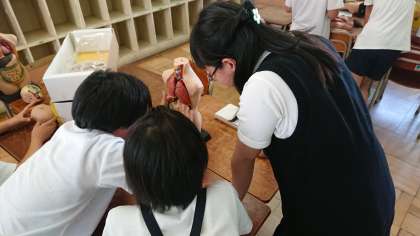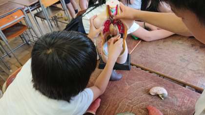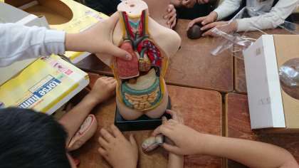ヒトの体つくりについて、人体模型を使って観察しました。臓器が外れるたびに